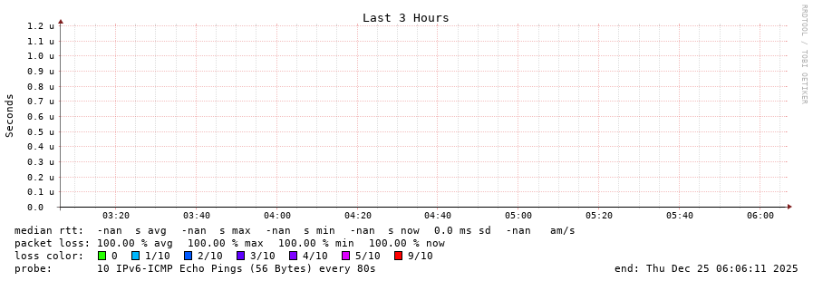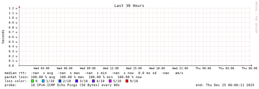 traceroute to fd78:93ae:fdfe::2 (fd78:93ae:fdfe::2), 30 hops max, 80 byte packets - Generated at 2025-12-25 06:00:01 3 > 4 > 5 > 6 > 7 > 8 > 9 > 10 > 11 > 12 > 13 > 14 > 15 > 16 > 17 > 18 > 19 > 20 > 21 > 22 > 23 > 24 > 25 > 26 > 27 > 28 > 29 > 30 >