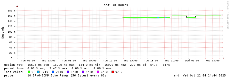 traceroute to 2a02:2f05:2113:7f00:220:4aff:fee0:220f (2a02:2f05:2113:7f00:220:4aff:fee0:220f), 30 hops max, 80 byte packets - Generated at 2025-10-21 23:00:01
